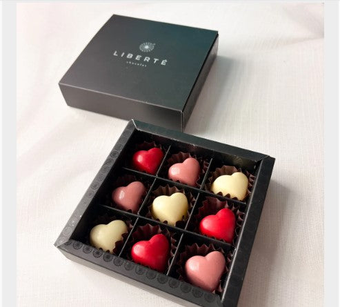 La Caja Bombones (9 unidades) es una forma dulce y elegante de celebrar San Valentín. Corazones de chocolate belga con rellenos cremosos inspirados en pastelería fina, pensados para sorprender y compartir.