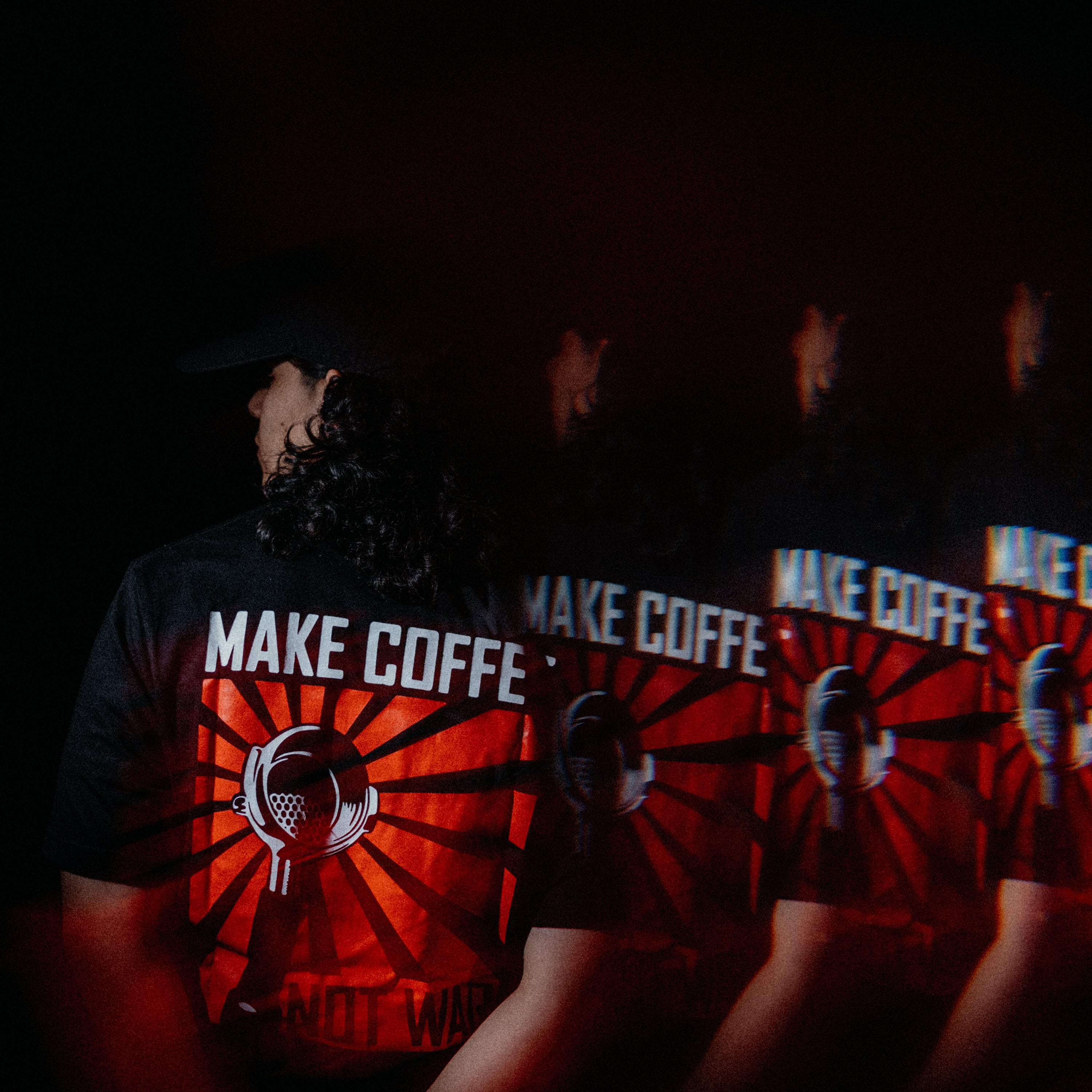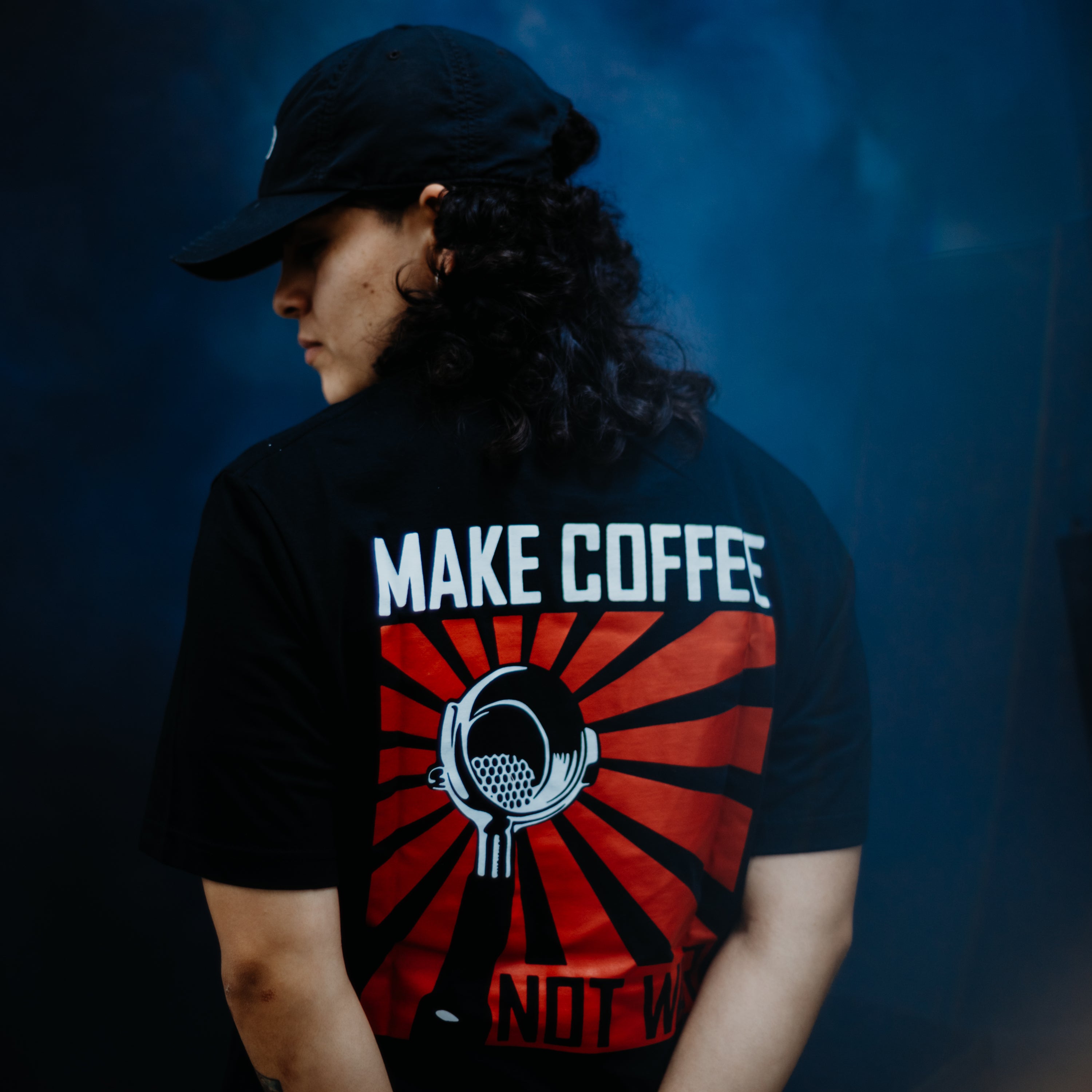 Polera negra estampado en serigrafía de Make Coffee Not War hecho por los secos de @taller_1536.